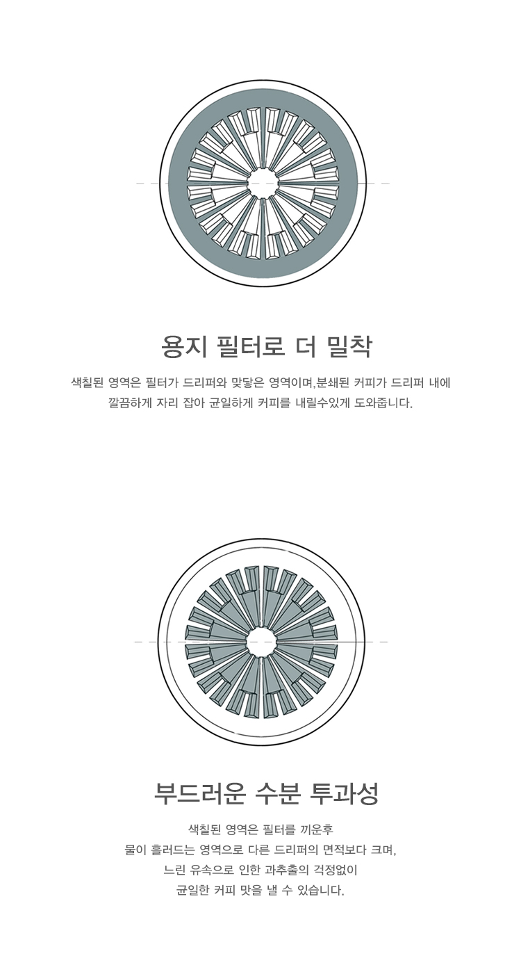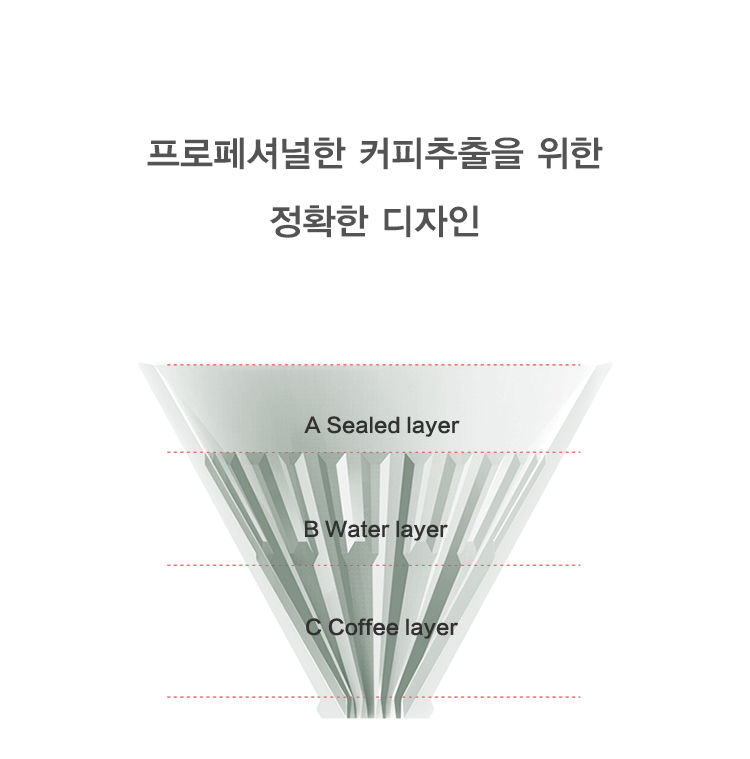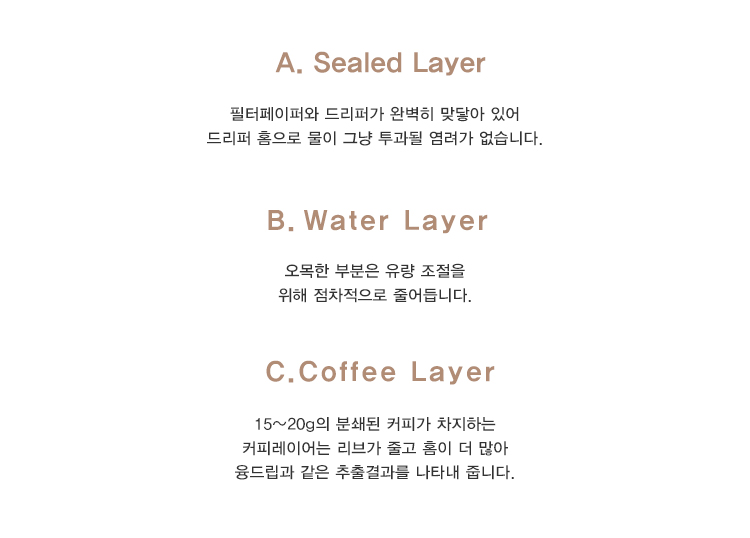 Sealed layer - 필터와 드리퍼가 밀착되어 바깥쪽으로 물이 나오지 않도록 합니다.