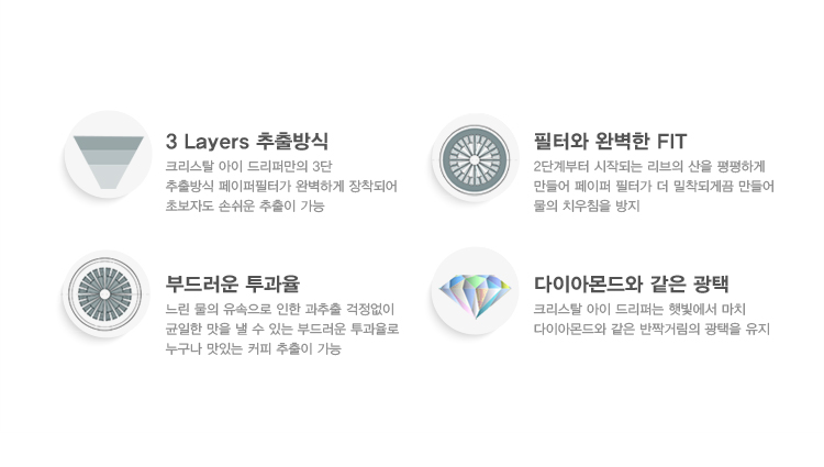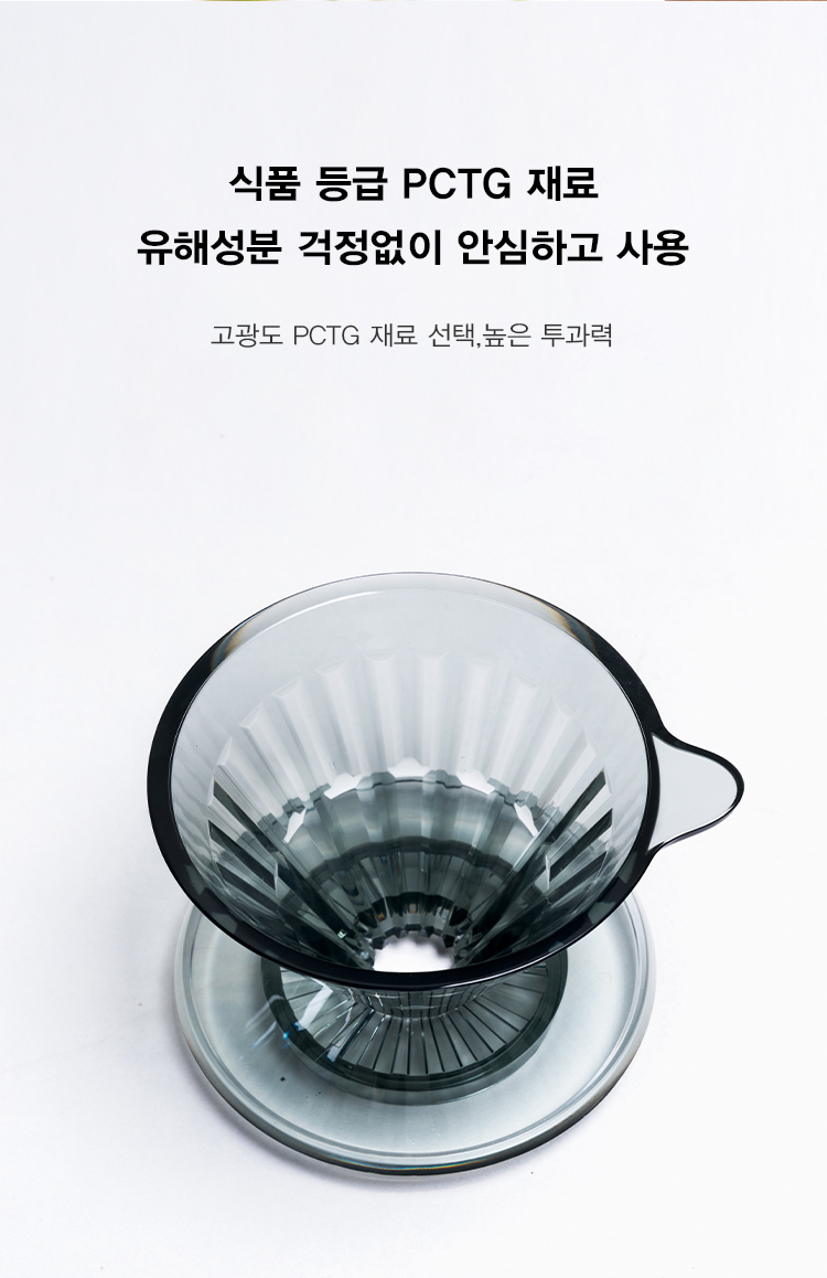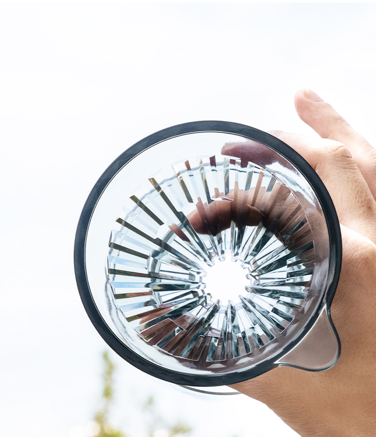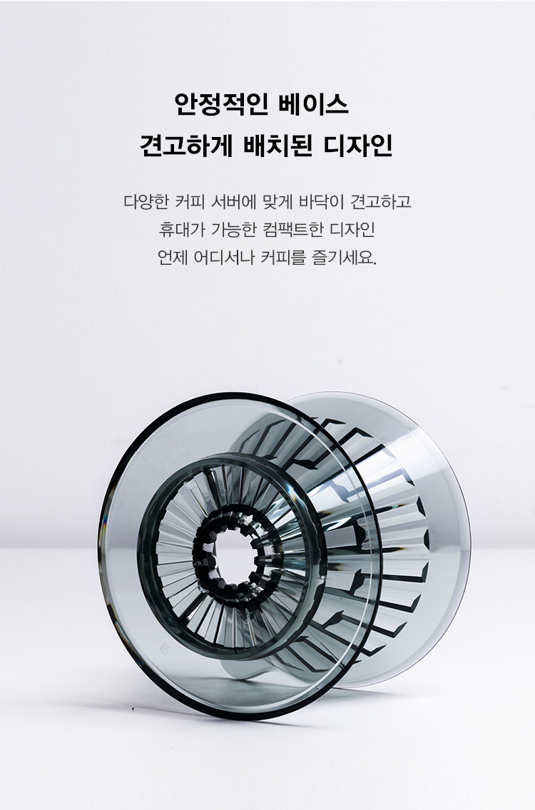 오목한 표면은 종이필터와 완전히 밀착되어 더욱 추출이 잘되도록 하며, 매끄러운 투과로 느린추출이 과다추출이 될 염려를 줄여줍니다. 또한, 다이아몬드형태로 매우 고급스럽습니다.